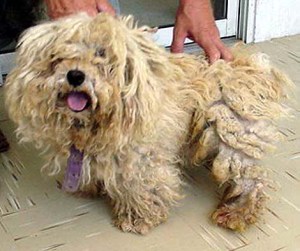A small tuft of matted hair will attract and entangle surrounding hairs into the area until it grows bigger and bigger, so it is quite important not to allow mats of hair to even start forming. I have seen dogs covered with matted hair all over the face and body with carpet-like consistency and this can become painful as it creates a hair pulling effect (“sabunot”) on the skin of the dog.